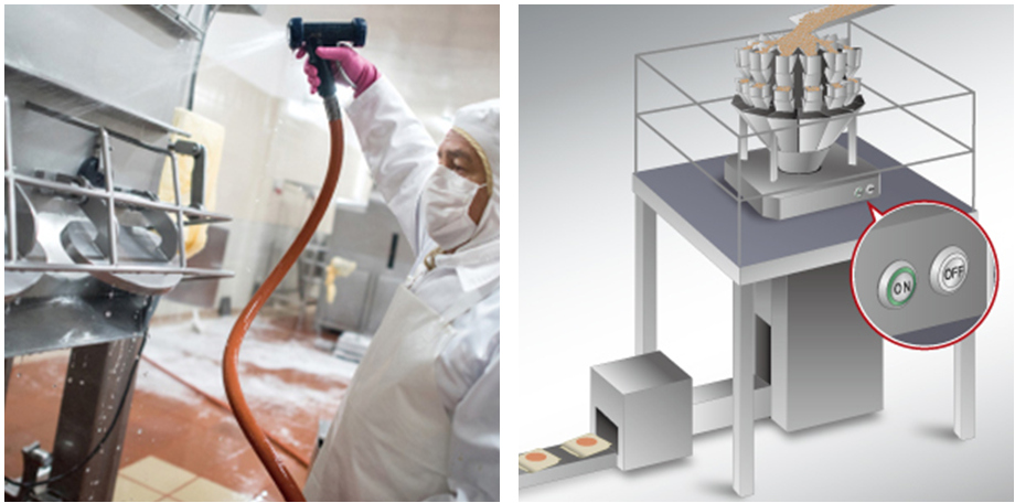 食品機械、高壓、熱水清洗設(shè)備,需要另外設(shè)置控制器食品加工生產(chǎn)線上的填料秤量控制裝置,根據(jù)衛(wèi)生管理要求,在變更材料以及每天的生產(chǎn)結(jié)束后,必須進行整體高壓清洗。在此就出現(xiàn)了如何選擇安裝于裝置主體的開關(guān)選擇問題。若只是普通的整體清洗,只需選擇通常的防水開關(guān)即可對應(yīng),但是,沒有能夠?qū)?yīng)高壓清洗的開關(guān)。因此,以前的填料秤量控制裝置主體上不能直接安裝開關(guān),必須用電纜延伸到別處安裝附帶電源開關(guān)的控制器等。因該原因在食品機械設(shè)置安裝時,須花費設(shè)置控制器的成本費用和工時,所以用戶一直在追求更好的設(shè)計。高防護等級的防水開關(guān)可直接安裝在裝置上,從成本和便利性考慮,在填料秤量控制裝置上直接安裝開關(guān)則為優(yōu)選方案。