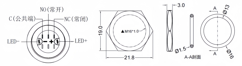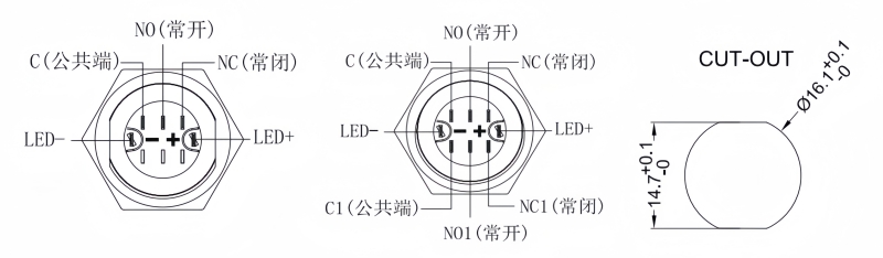 MATERIALS BUSHING : Stainless Steel / Nickel plated brass / Aluminum alloy BASE : PBT, PC ACTUATOR : PC ; Stainless Steel / Nickel plated brass / Aluminum alloy INNER ASSEMBLY : POM / PA66. SPRING : Spring steel. SEALING : Sillicone. O-Ring : Sillicone TERMINAL : Brass,with silver or gold plated. HEX NUT : Nickel plated brass