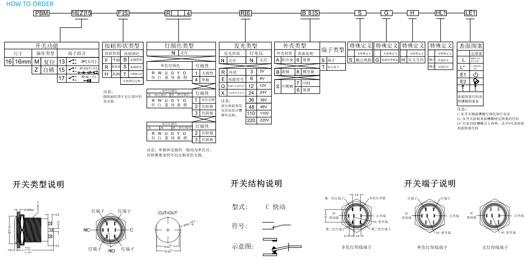 MATERIALS BUSHING : Stainless Steel / Nickel plated brass / Aluminum alloy BASE : PBT, PC ACTUATOR : PC ; Stainless Steel / Nickel plated brass / Aluminum alloy INNER ASSEMBLY : POM / PA66. SPRING : Spring steel. SEALING : Sillicone. O-Ring : Sillicone TERMINAL : Brass,with silver or gold plated. HEX NUT : Nickel plated brass