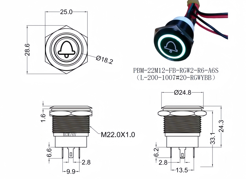 Led: 1.8V/3V/6V/12V/24V/36V/48V/110V/220V ILLUMINATION BASE RATlNG: Red, Yellow and Orange:20mA 1.8V; Blue, Green and White:20mA 2.8V Beads Color:R/U/G/Y/0/W/RGB |
