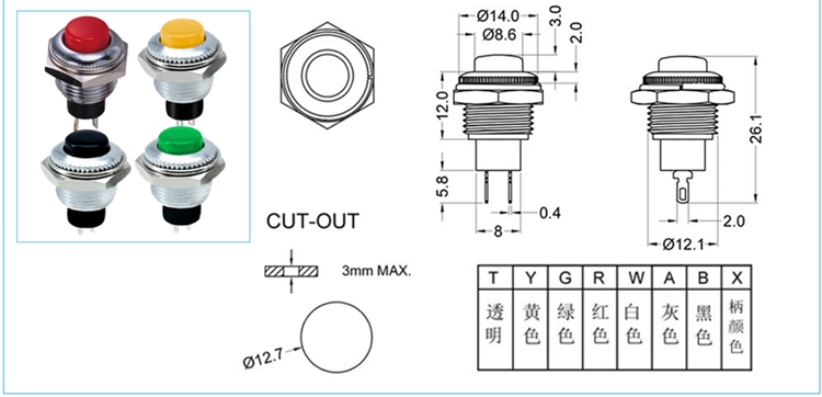 SPECIFICATIONS Panel Thickness: Ø12.70mm Circuit: SPST Function: Momentary