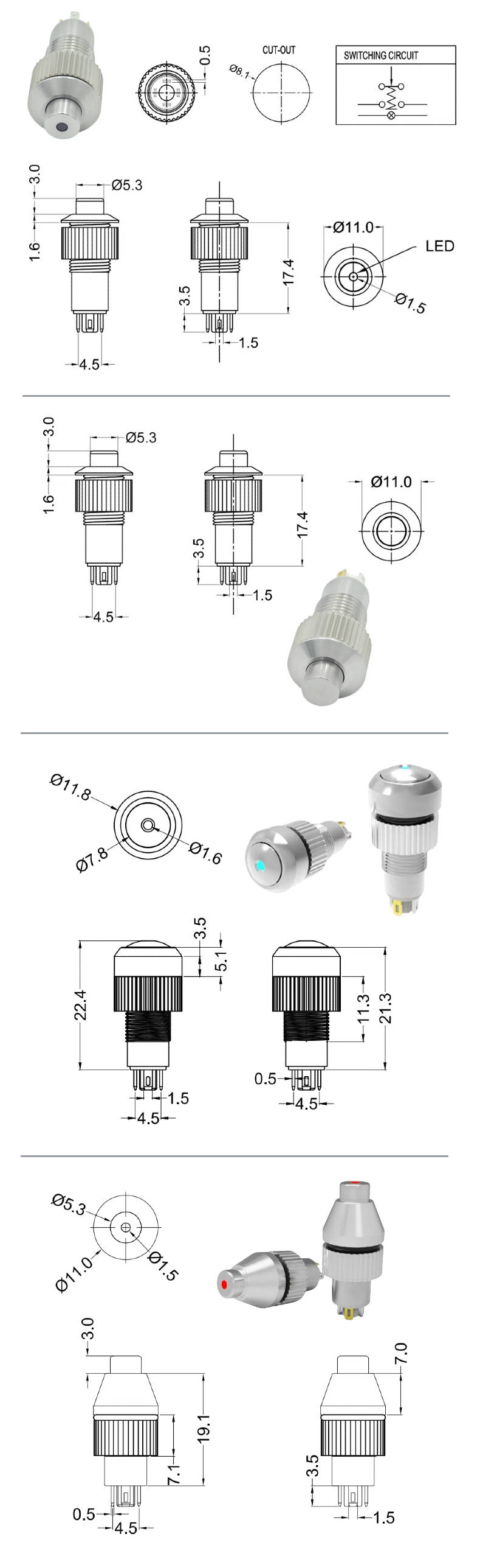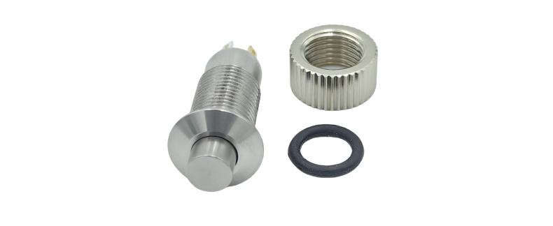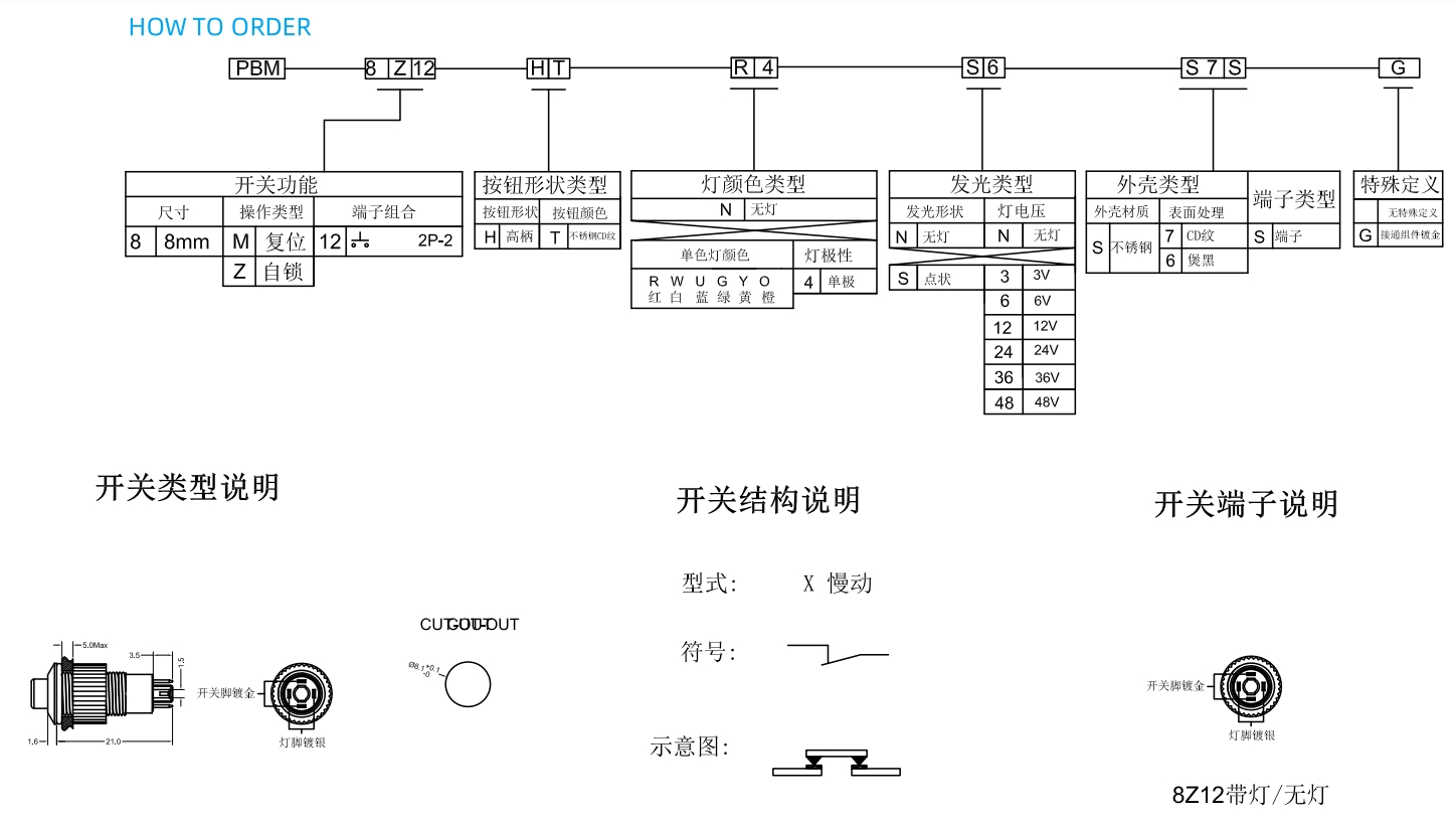 MATERIALS BUSHING : Stainless Steel / Nickel plated brass / Aluminum alloy BASE : PBT, PC ACTUATOR : PC ; Stainless Steel / Nickel plated brass / Aluminum alloy INNER ASSEMBLY : POM / PA66. SPRING : Spring steel. SEALING : Sillicone. O-Ring : Sillicone TERMINAL : Brass,with silver or gold plated. HEX NUT : Nickel plated brass
