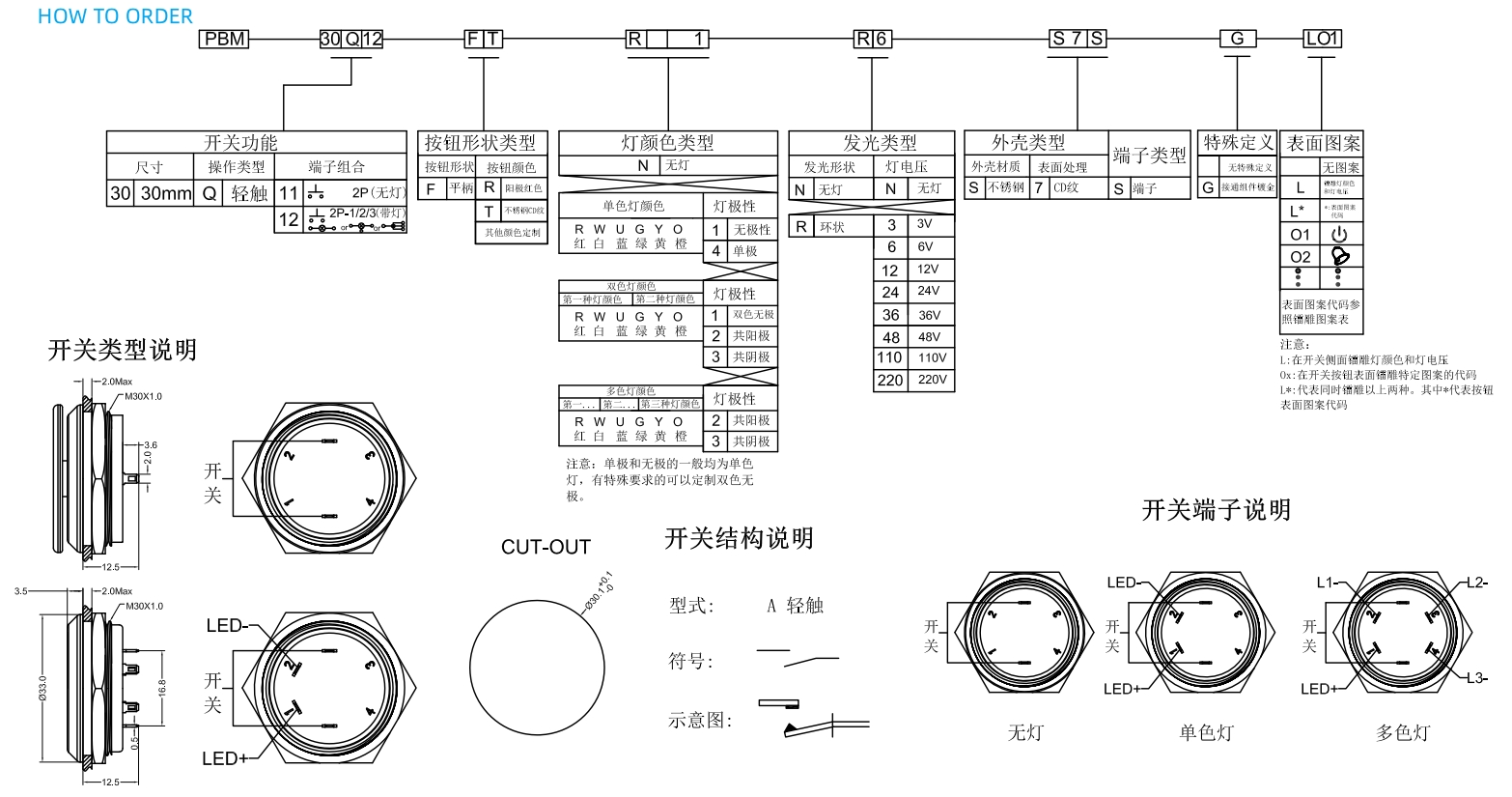 MATERIALS BUSHING : Stainless Steel / Nickel plated brass / Aluminum alloy BASE : PBT, PC ACTUATOR : PC ; Stainless Steel / Nickel plated brass / Aluminum alloy INNER ASSEMBLY : POM / PA66. SPRING : Spring steel. SEALING : Sillicone. O-Ring : Sillicone TERMINAL : Brass,with silver or gold plated. HEX NUT : Nickel plated brass