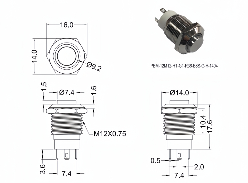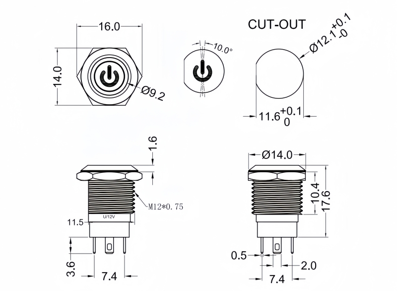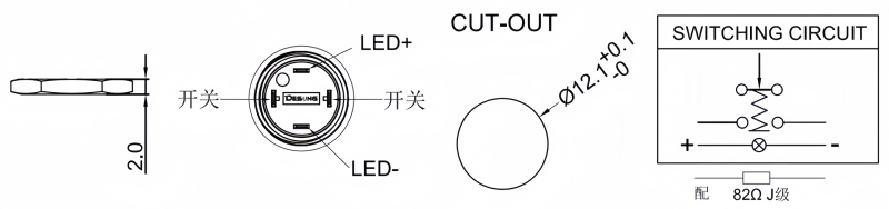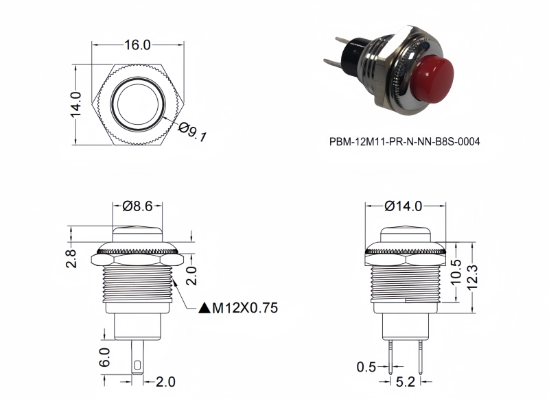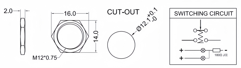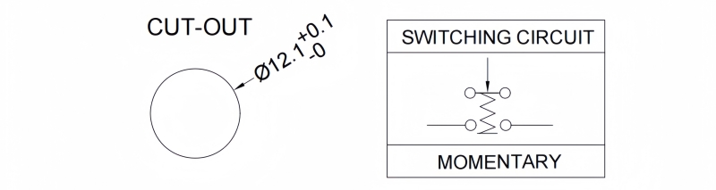 SPECIFICATIONS Panel Thickness: Ø12.20mm Function:(ON)-OFF Momentary Contact Rating: 0.2A/250VAC 0.5A/12VDC Mechanical Life: 100,000 cycles Electrical Life: 50,000 make-and-break cycles at full load Torque: 5~14Nm Travel: About 2.0mm