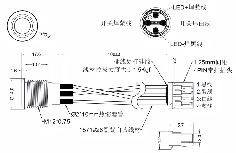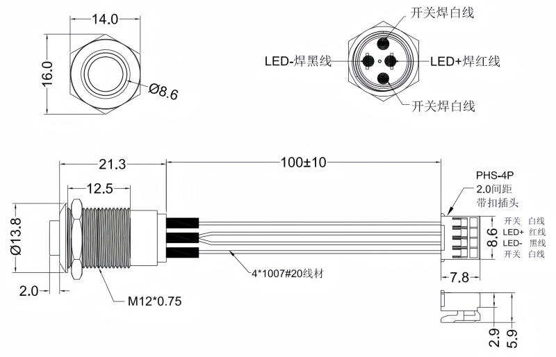 MATERIALS BUSHING : Stainless Steel / Nickel plated brass / Aluminum alloy BASE : PBT, PC ACTUATOR : PC ; Stainless Steel / Nickel plated brass / Aluminum alloy INNER ASSEMBLY : POM / PA66. SPRING : Spring steel. SEALING : Sillicone. O-Ring : Sillicone TERMINAL : Brass,with silver or gold plated. HEX NUT : Nickel plated brass