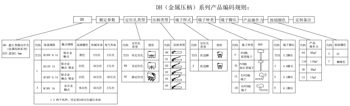 Contact Rating: DC 30V 3A DC15V 1A Electrical Life: 20,000cycles Operating Force:60gf MAX