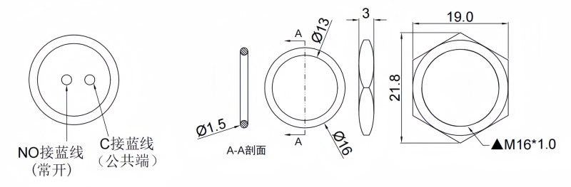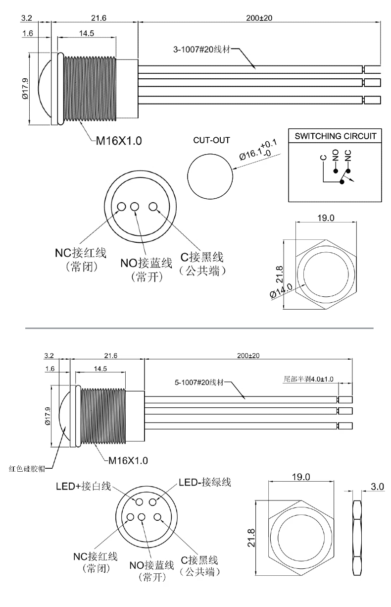 SPECIFICATIONS Panel Thickness: Ø16.20mm Function:ON-OFF Latching or (ON)-OFF or (OFF)-ON Momentary Rating(Resistive load):3A 250V AC