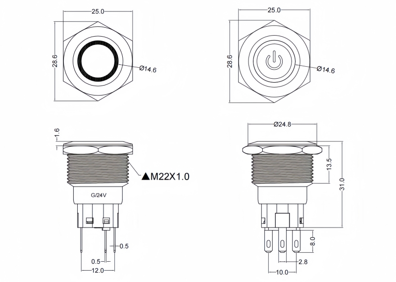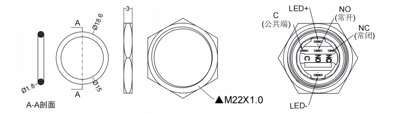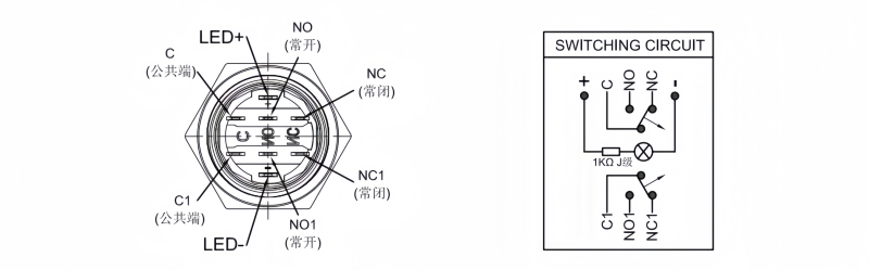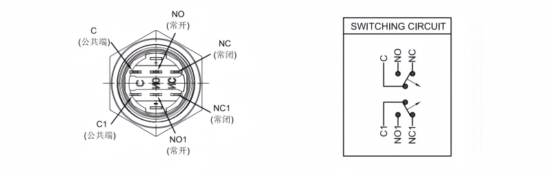 MATERIALS BUSHING : Stainless Steel / Nickel plated brass / Aluminum alloy BASE : PBT, PC ACTUATOR : PC ; Stainless Steel / Nickel plated brass / Aluminum alloy INNER ASSEMBLY : POM / PA66. SPRING : Spring steel. SEALING : Sillicone. O-Ring : Sillicone TERMINAL : Brass,with silver or gold plated. HEX NUT : Nickel plated brass
